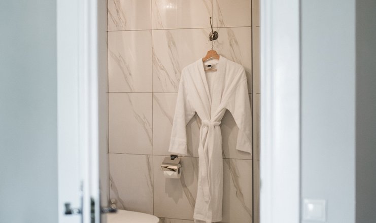 Санузел: с ванной или душевой кабиной, тапочки, туалетные принадлежности, фен, халат