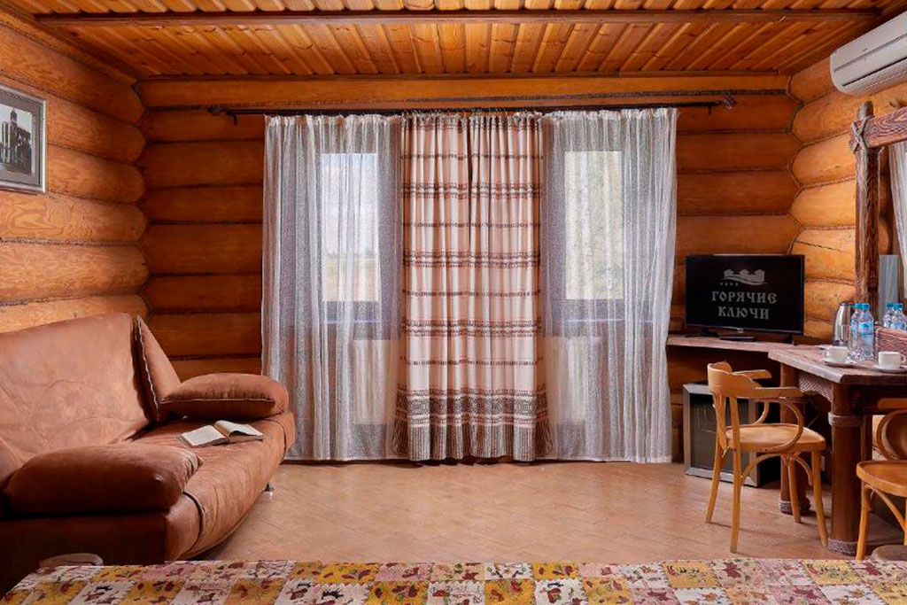В номере: вешалка, диван, зеркало, кровать двуспальная, прикроватные тумбочки, стол, стулья, шкаф, кондиционер, мини-холодильник, телевизор, телефон, холодильник