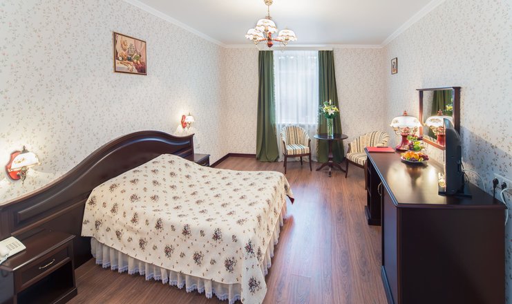 В номере: две односпальные (90*200 см.) кровати – трансформеры, сдвигаются без шва, тв цифровое, телефон, кондиционер, мини-холодильник, письменный стол, стул, зеркало, настольная лампа, бра, туалетный стол, пуф, комод-буфет, диван раскладной, кресло, гардероб с вешалками, вешалка для верхней одежды, багажница, чайник, кофе-машина