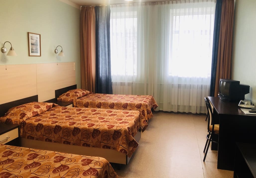В номере: вешалка, зеркало, кровати односпальные: 3, прикроватные тумбочки, стол, стулья, шкаф, телевизор, чайный набор посуды
