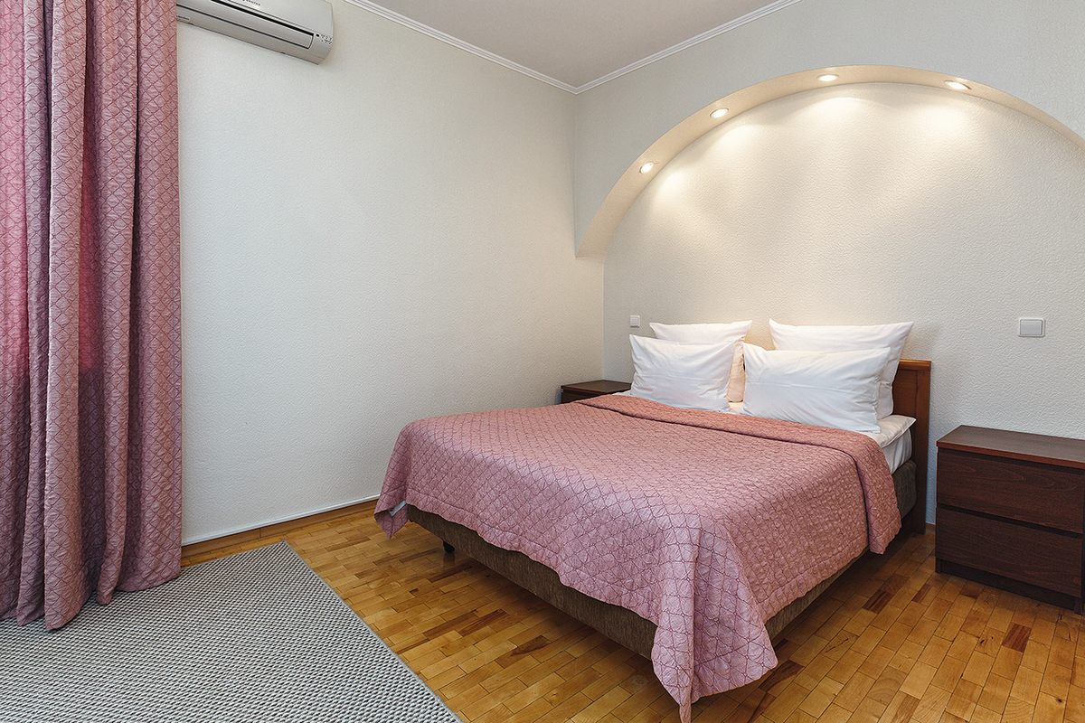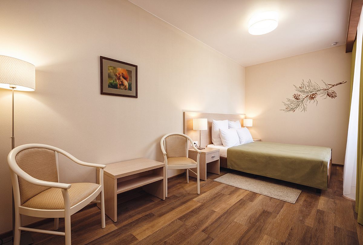 В номере: две односпальные кровати или рдна двуспальная, прикроватные тумбочки, шкаф, столик журнальный, туалетный столик, телевизор, телефон, чайник, холодильник, сушилка для белья