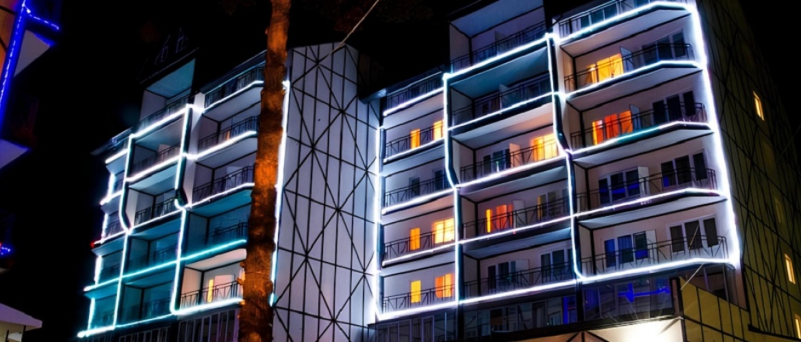 Архитектурное решение отеля выполнено в альпийском стиле, что гармонично вписывается в окружающий пейзаж. Он состоит из двух семиэтажных корпусов, между которыми располагаются просторные зоны отдыха. Гостиница имеет емкость до 350 человек, предлагая своим посетителям комфортабельные номера различных категорий: Стандарт и Люкс. Каждый номер оборудован всем необходимым — от душа до удобной мебели. Среди удобств можно найти телевизор, холодильник и фен, что позволяет создать комфортные условия для проживания.