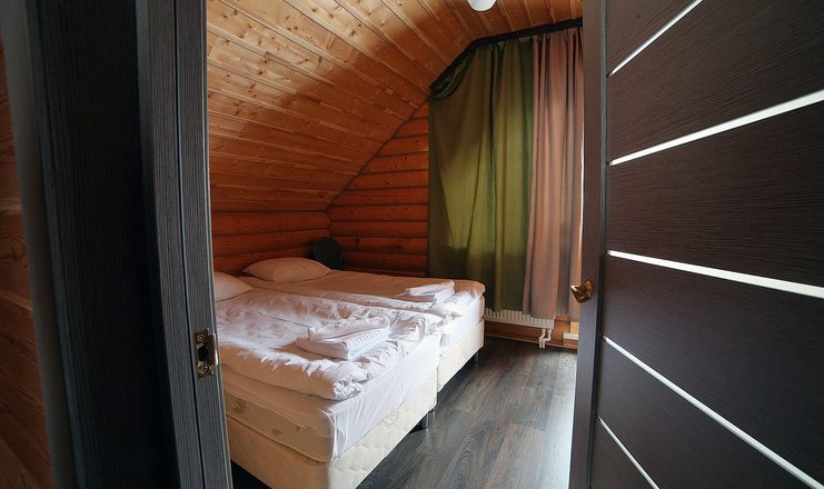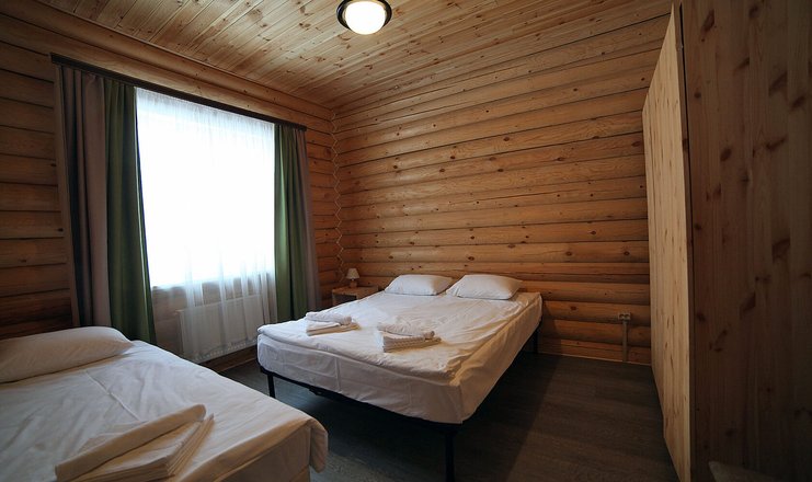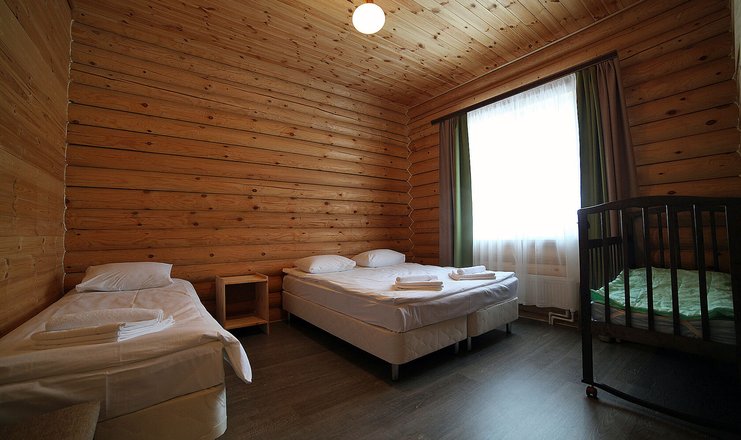 В номере: Кухня вешалка, зеркало, кровати односпальные, кровать двуспальная, прикроватные тумбочки, стол, стулья, шкаф, микроволновая печь, набор посуды, плита электрическая, телевизор ЖК, чайный набор посуды, электрочайник